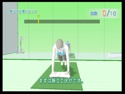バランスWiiボードの上に両足を乗せ、お尻は床につけ、腹筋をする姿勢をとる両手を着いて、足を後ろに伸ばし、腕立て伏せの姿勢をとる